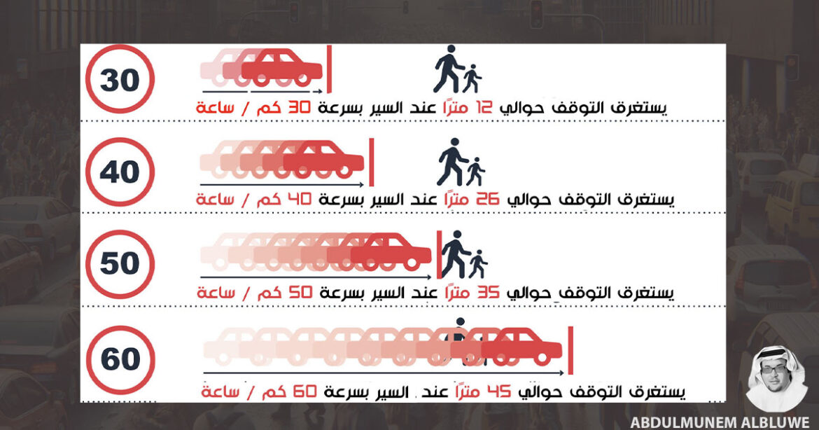 - عند سرعة 60 كم/ساعة، تستغرق مسافة التوقف حوالي 45 مترًا.