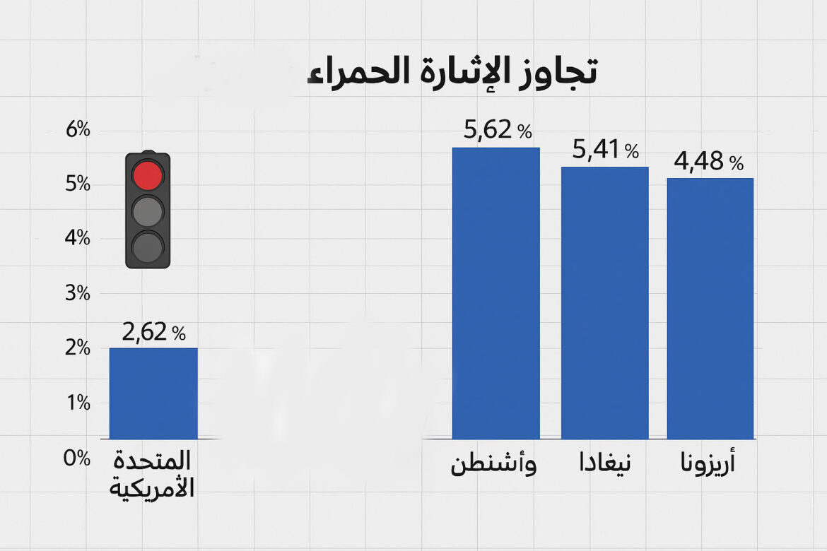 تسجل بعض الولايات نسبًا أعلى من الحوادث المرتبطة بتجاوز الإشارة الحمراء مقارنة بالمتوسط الوطني: